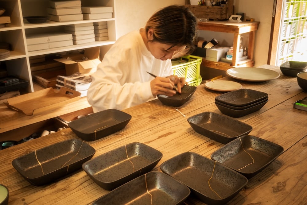 私は、自分たちの手で作り出した陶器を無闇に捨てたくないと願っています。よくある陶芸家のイメージだが、「違うっ」と叫びながら作品を床に叩きつけるようなことはしません。だから、私たちの工房には、ちょっとした形の歪みや釉薬のムラで世に出ることを許されなかった作品たちが、静かに息をひそめています。それらは完璧ではないものの、私にとってはかけがえのない創作活動の一部なのです。かつて、金継ぎ職人の図師さんと交わした話が心に浮かびます。「陶芸家と金継ぎ師は仲間です。壊れた器が美しく修復できることを知れば、もっと気軽に器を使えるようになります。私は、そんな日常のささやかな支えでありたいんです。」そんな中、スタッフのサトミちゃんが図師さんから金継ぎの技術を学び、ONE KILNに新たな風を吹き込んでくれました。彼女は、世に出ることを許されなかった器たちの歪みやユニークな割れにインスピレーションを受け、それらの修復に取り組み始めたのです。